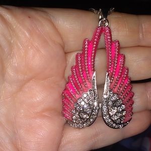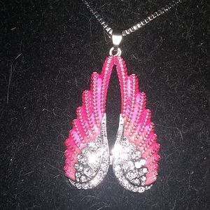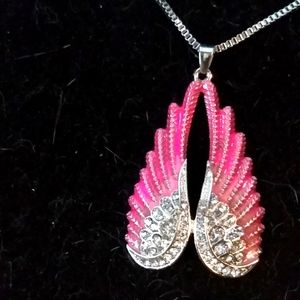 PINK Enamel and White Crystal Wings Silver Tone Pendant Necklace