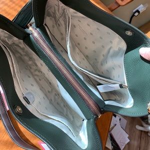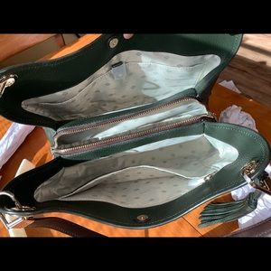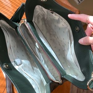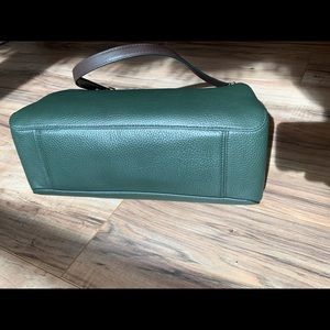 This is an awesome pebbled leather kate spade shoulder bag in a really pretty shade of green (there is no pattern on the bag, those are shadows from the window)! Interior material is spade flower jacquard lining in a light mint green shade that perfectly compliments the exterior dark green shade. Measurements are in the listing description, strap/handle drop is 11”.
