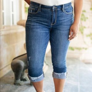 The Breezy Capris are the perfect cropped capri! These capris are a medium wash and have slight distressing around the hems. You can wear them rolled up or straight for different looks. Pair them with your favorite blouses and sandals.