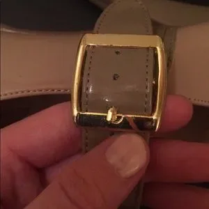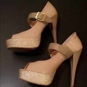 Steve Madden Nude platform heels size 9! In good condition! A buckle like strap that goes across the foot and sparkly accents! Heel is a little over 4 inches!