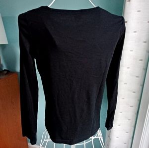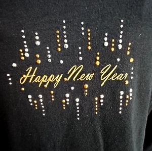 Bring in the new year with a bit a sparkle with this "Happy New Year" long sleeve shirt by Target. It is black with silver and gold sparkly embellishments on the front. Long sleeve and slight scoop neck. 100% Cotton. Women's size Small. Approximate pit to pit measurement is 18" and length is 23.5". Worn only once or twice excellent used condition.