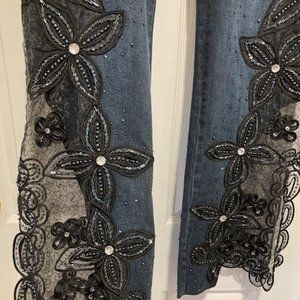 Dark washed Denim with floral lace, plus beading embellishments and detailing.