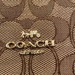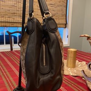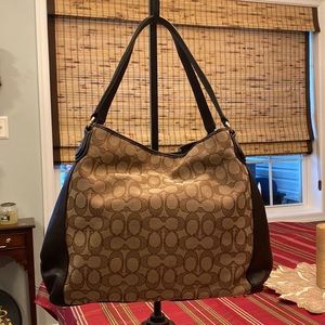 Coach Edie shoulder bag. Leather and logo fabric. Features inner dividers and pockets, top snap closure, two slip pockets and bag charm. EUC. No scratches tears or stains noted. Interior very clean as well. Non-smoking, pet friendly home.
