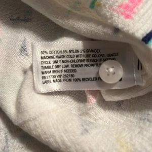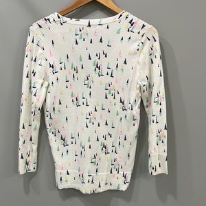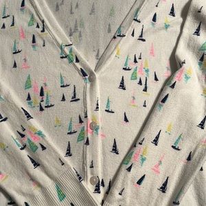 NWOT, Merona, 3/4 length sleeve cardigan. Multicolor sailboat print, v-neck, button front, white. I’ve never worn this, it has been laundered. Approximate measurements are 17” underarm to underarm (buttoned), 17” underarm to bottom hem.
