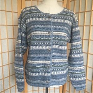 NWT Bemidji Woolen Mills Blue Dusk Fair Isle Style Wool Sweater…front button closure…shades of blues/grey…approximate measurements…bust 21 1/2” pit to pit…length 23 1/2”…sleeve length from top of neck 27”(has a bit of a drop sleeve)…SZ L…NWT…Questions always welcomed