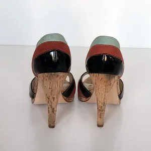 Steve Madden d'orsay open toed pumps in black patent, rust and teal suede with cork heels. So cute with lots of wear left! Comes with original box.