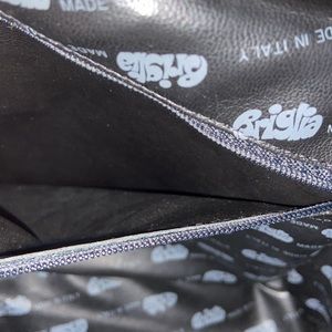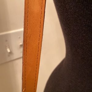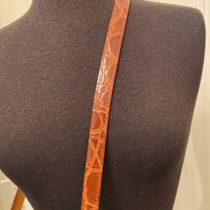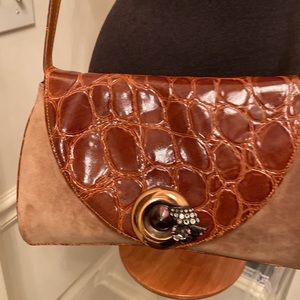 Stunning tan suede bag. Embossed patent leather crocodile print. Flap over snap closure with embellished art decor. Zip pocket inside clean signature lining. Removable & adjustable 28 inch strap. Can be used as a clutch bag. Impeccable condition