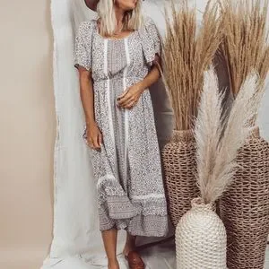 Shop Stevie Boutique floral dress featuring a comfortable and stretchy waistband, flutter sleeves, and a lace detail. In new condition.