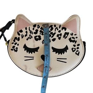 NWT! Luv Betsey Johnson Coin Purse Wristlet Kitty Leopard. Adorable soft sided polyurethane zip around wristlet/coin purse/wallet. Front features the kitty leopard face & back has “luv Betsey” logo. Interior is stripe fabric lined with a slip pocket on the side. Black wristlet strap & zipper pull. Even though it is NWT, it does have several black marks to exterior (see pic 4). Priced accordingly. See photos for approximate dimensions. Bundle to save big!