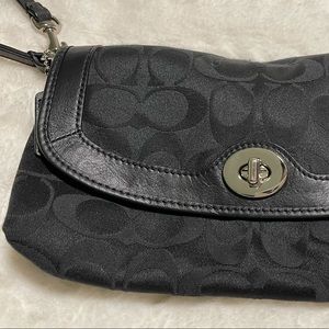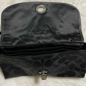 This large black Coach wristlet is ready for a new home! With the signature “C” logos all over the wristlet, silver hardware, and leather strap, this bag is in excellent condition. The inside of the bag has satin-like fabric with 8 spots for cards on one size and a single card spot on the opposite side. This bad is approximately 9 inches by 5.25 inches. Willing to negotiate!