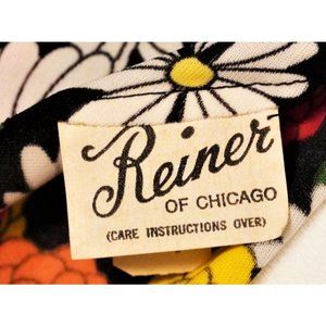 Made by Reiner of Chicago, this groovy floral dress can be worn for a variety of styles! I don't see a tagged size unless it is the "8" as the 14 1/2 is the style number. Please refer to the measurements provided below for an accurate fit. ILGWU tag, made in the USA of semi-sheer 100% Polyester with sheer black long sleeves that have the floral fabric at the wrists. Semi empire cut. Excellent condition except for two small rusn near the underarm on the back that I didn't even see until measuring. I do have more photos available if you message me.