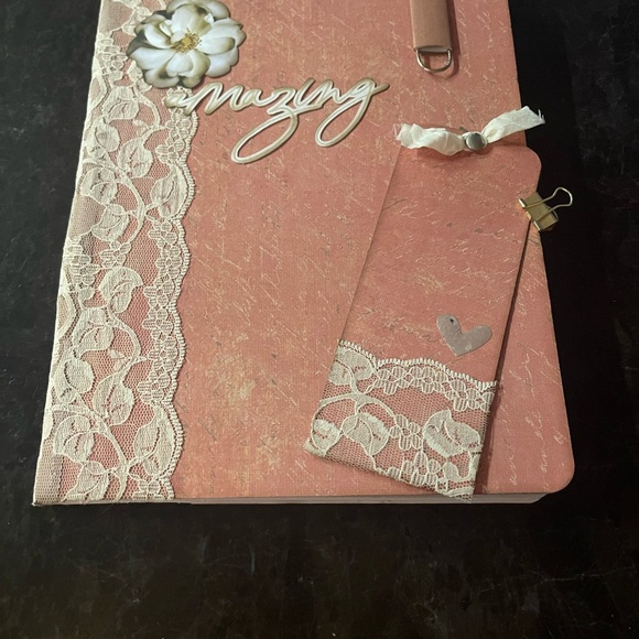 Note book journal, comes with lace, decorative book mark, decorative paper clip. Mini clip. Lots of blank pages to write on. Made by me.