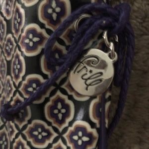 Vinyl outer pattern. Purple paisley fabric on inside of purse has zipper compartment with Vera Bradley ribbon pull. Purple vinyl trim. 13” wide and 6.5” tall. Side outer pockets. Magnetic closure and water resistant. This item has never been used and is new without tags.