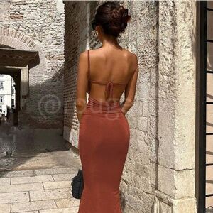 Backless Rust Brown Cowl Neck Long Slim Dress