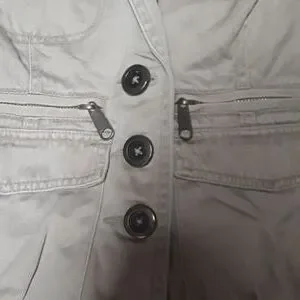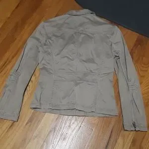 Smoke free home. Darting at elbow area. Zippers at sleeves and front pockets. Khaki color. Machine washable. Thicker material.