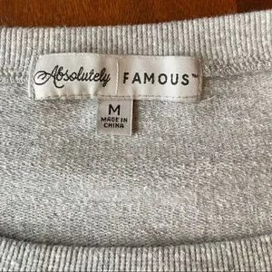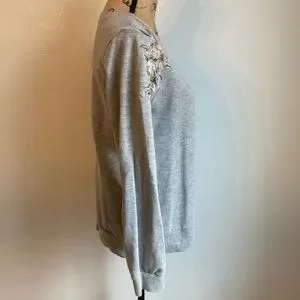 Heather gray sweater with beautiful embroidered flowered detailing at both shoulders. Soft and medium heaviness, great for winter or for layering. Made of 60% cotton, 40% polyester.