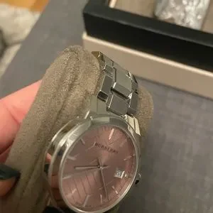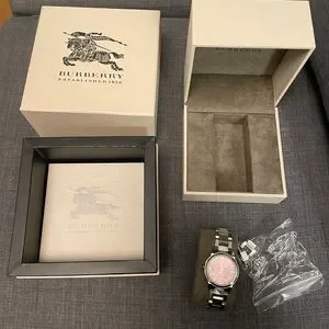 Swiss made Burberry watch, used in good working condition. Shows date. Includes bracelet inserts to adjust fit. Sapphire crystal face. Note no visible scratches on glass face. Stainless steel watch case and bracelet have some wear and scratches throughout from use. Water resistant case to 50 meters.