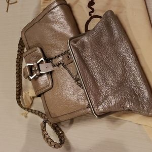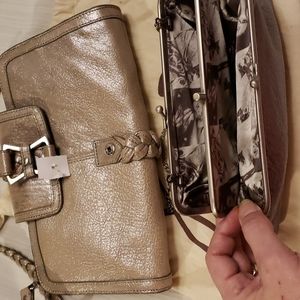 great pre-owned condition it looks to be a metalic gold/ biege. it has a detachable evening bag that snap in. measurements 10" W X 6" H 2" D shoulder strap 8"