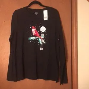This shirt is very comfortable, would look great with jeans m, and offers a beautiful winter snow scene with a cardinal and evergreen