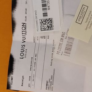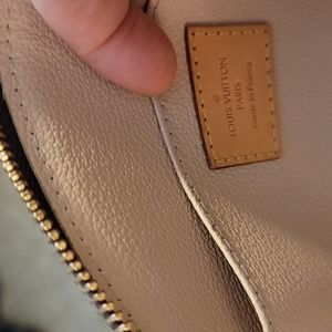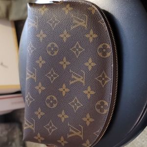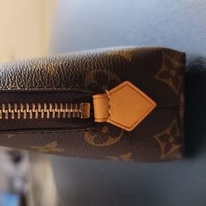 Gorgeous, very gently used Louis Vuitton monogram cosmetic pouch- comes with dustbag, box and receipt. This bag was stored carefully and used for a short time. Date code is SR2198. Small finger mark on one of the side leather tabs- very light.