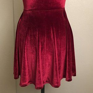 I am coming to grips that I will never be my pre-pandemic size, so please let these outfits go out and have some fun! This super cute dress is made of four-way stretchy velvet in a deep rich red merlot color. The dress form is set to size 12 for these photos, but also fit great as a size 10. Laying flat, the bodice measures 15 inches pit to pit, but it is very stretchy. The skirt is 18 inches long from the natural waist. This dress looks great on the dance floor!