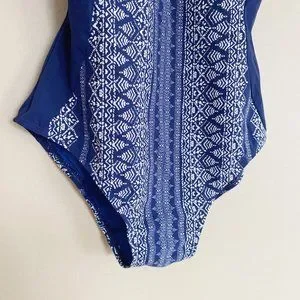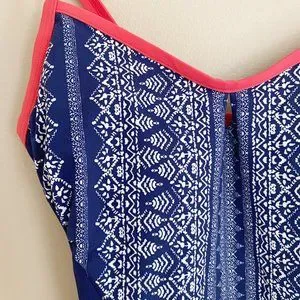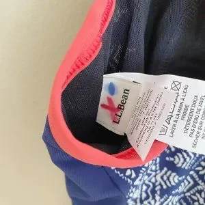 Description: LL Bean one piece blue white mixed print vertical stripe patterned swim suit with small front keyhole detail, scooped vneck, coral pint trip with adjustable straps & lightly padded shelf bra. Suit is lined.