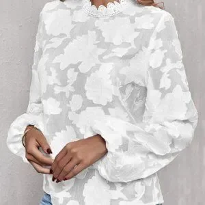 Modern Classic Oblique Floral Leaf Print Mock neck bishop sleeve Blouse Top cream