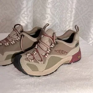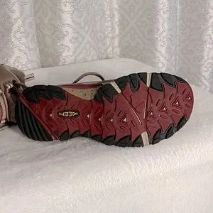 Keen brown and burgundy hiking shoes.