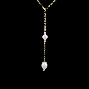 Y necklace drop pendant with genuine pearls and 18k GP chain. Real pearls in creamy white and pale pink. Chain length 18 inches plus 3 inch pendant drop. Keywords: pearl lariat necklace choker y 18k gold plate boho wedding jewelry gift baroque elegant dangle pendant jewelry necklace chain layered necklace layer necklace lacking necklace stacking necklace bride bridal bridesmaid wedding jewelry artisan bohemian white pearl cream pearls freshwater pearls new necklace baroque pearls baroque pearl blush