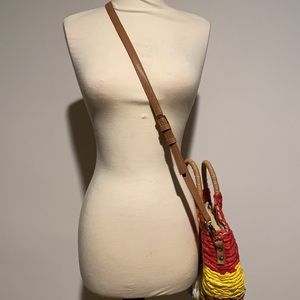 BP by Nordstrom woven straw handbag, that can be a crossbody as well, half moon shape, colorful, earth tones, top drawstring closure, just gorgeous, interior is fully lined with one multi purpose pocket, very roomy, detachable strap, measurements are approximately as follow: