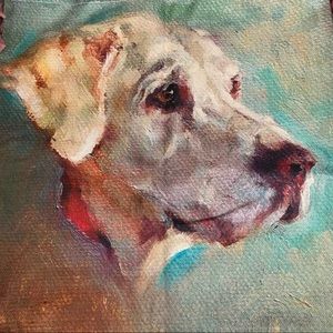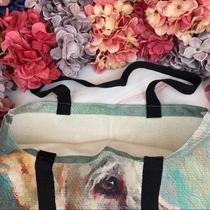 This lightweight eco friendly tote bag has the portrait of a yellow lab. The sweet dog has a red collar, and soft caring brown eyes. The bag has beautiful watercolor shades, with a soft blue green background, and black handles. A great gift for any dog lover, especially one who has owned a yellow lab at some point in their life!