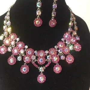 Pink rhinestone neckace and earrings set
