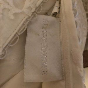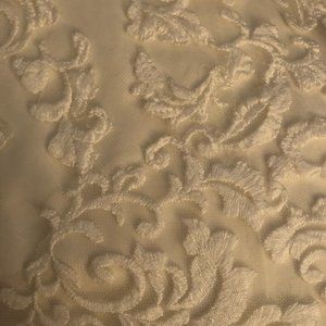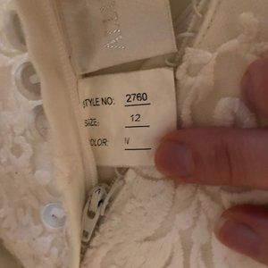 This is my wedding gown. There were some alterations made to the size 12 dress on the bust and waist. The waist is now 28.5 inches and the bust is 34 inches. The original bust was 38, the original waist was 30, and the hips (unaltered) is 41.5 inches. The dress was worn for the day of my wedding only. A few buttons are missing on the back, but all loops are in tact. The lace is beautiful and the dress is comfortable- even on a hot day! (We got married in August in the Midwest and it was a scorcher!) Please message me with any questions you may have about it. Please also feel free to make me an offer!