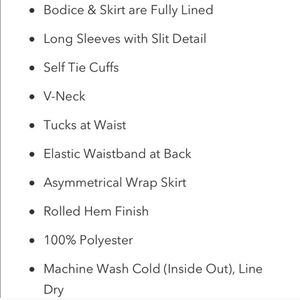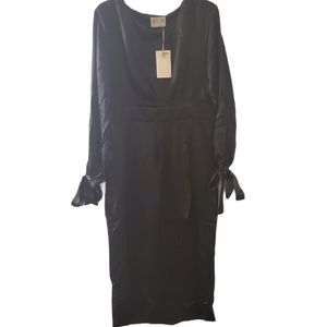 Features: New with tags. In great condition. Black flowy dress that be dressed up or down with boots or heels. Tie detail at tge ends of the arms. Faux wrap skirt. V neck. Black. BOHO silhouette. Lined. Cut out slit arm detail. (STOCK PHOTO OF THE GREEN DRESS IS TO SHOW FIT. THIS DRESS IS BLACK)