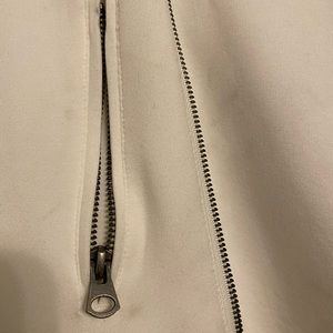 Never worn, but it does have a few minor stains as shown in picture. It’s a fun jacket that can be worn in a couple different ways. The color is off-white.