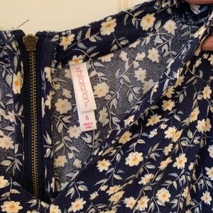Dark muted blue with white and yellow flowers. The front has a lace up section to adjust how cinched it is at the waist