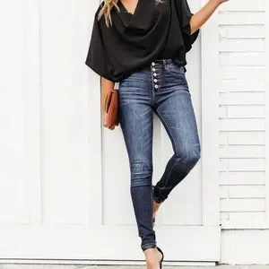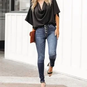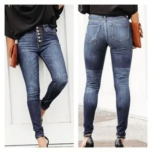 These dark wash jeans feature a stretch and a skinny leg. Secured with front button closures.