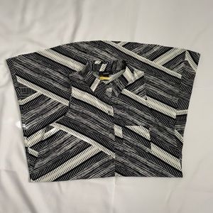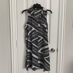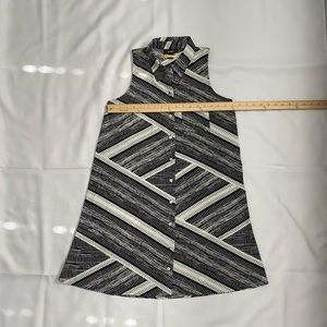 Alfani Size 6 printed black white geometric print, collar, shift dress, shirt, w/button front and collar. Sleeveless. Above knee length. Casual or Dressy for any occasion. Summer, spring, or winter w/cardigan. Loose fit. *In Excellent condition. Worn once and dry cleaned. See pics. Measurements are approx. two wearing are stock photos.