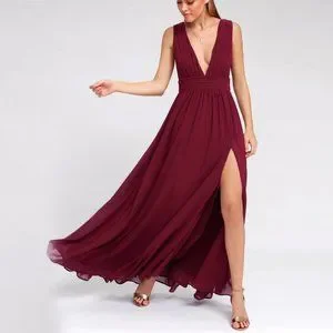 You'll be goddess-like for the entire evening in the Lulus Heavenly Hues Burgundy Maxi Dress! Georgette fabric drapes alongside a V-neck and back, and lays across a banded waist. Full maxi skirt has a sexy side slit. Hidden back zipper with clasp.
