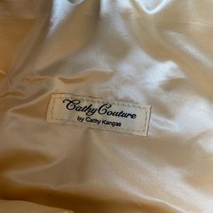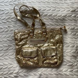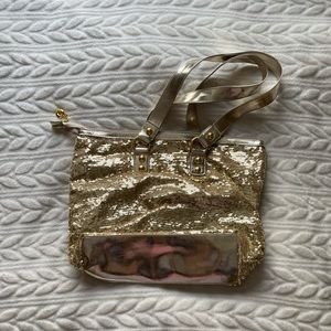Satin inside lining, gold sequin design outside, lots of pockets, dimensions 4x11x14”