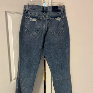 BRAND NEW WITH TAGS! Abercrombie & Fitch High Rise Mom Jeans, Size 25 (0), medium wash, slightly ripped, 10.5” rose, very stretchy and flattering, never worn before!