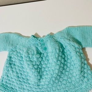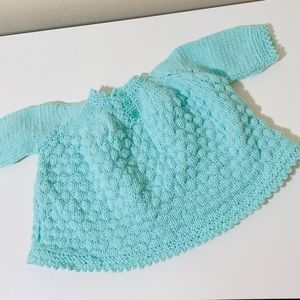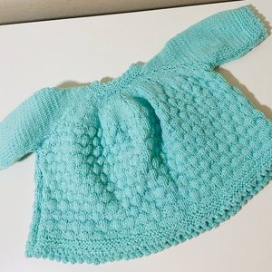 Adorable infant sweater dress made with love by a real champion knitter of a grandma! Intricate scalloped design & matching neck buttons. Fits newborn to 6 months. Polyester yarn, hand wash only.