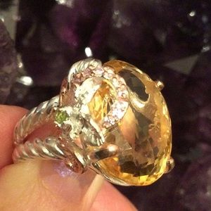 A fabulous Genuine Citrine, notice the depth of this stone in this custom made setting ! It’s sits up high and majestic, stylized with Pink Topaz, tiny Peridot and on other side flanked by a Genuine Aquamarine. Nicely set in a solid .925 silver setting, very well made, no lightweight flimsy setting here. Everything top class !