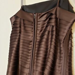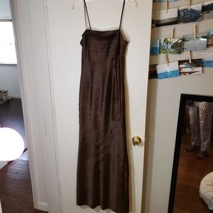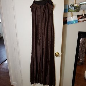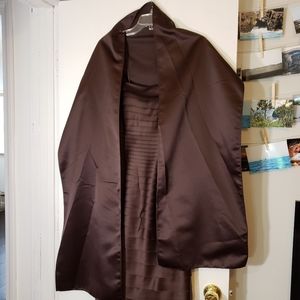 JS Collections brand brown ruffled evening gown with matching shawl. Spaghetti strap maxi dress with zip-up backing. Silky and shiny material. Polyester / spandex shell with black polyester lining. Comes with storage bag!