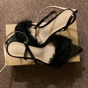 Fur fluffy patent leather leather ankle strap 4 inch gold heel sandals