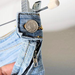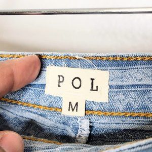Pol TKP113 Striped Denim Flare Leg Raw Hem Blue Light Wash Jeans Size Medium. These jeans have a zip and button side. Made of cotton.