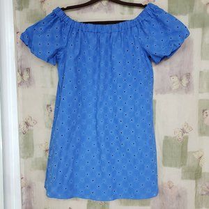 Blue eyelet embroidered off-the-shoulder short puff sleeve dress