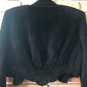 Absolutely stunning black suede bolero jacket by rodeo artist designer Jan Faulkner in perfect condition, this is so hot on! perfectly nips the waist. Black studs enhance the cutout floral design. Size M