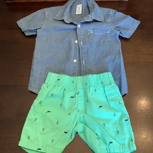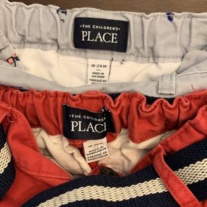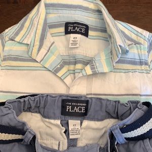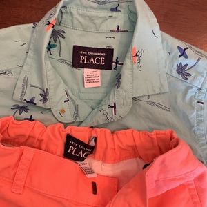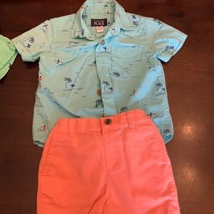 Lot of boys clothes 💙 One Carter’s outfit includes: short sleeve jean shirt with teal shorts with anchors, Size: 2t. Two The Children’s Place outfits includes: short sleeve button down shirts with shorts 🩳 size: 18-24m. One The Children’s Place outfit includes: short sleeve striped button down shirt with blue shorts and belt, size: 2t. Two The Children’s Place shorts 🩳 size: 18-24m. Three The Children’s Place short sleeve shirts size: 18-24m. Please see photos 📷 Comes from a smoke free and pet free home 🏡 clothes are like new!!! No rips, no tears, no stains!!