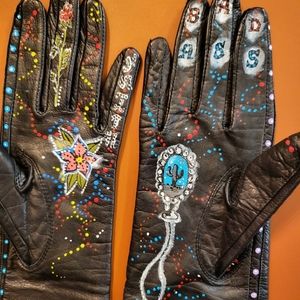 vintage luxurious leather gloves with silk lining. the size shown is M, but those made for very petit hands. Will work for long fingers. very delicate, beautiful, unique! custom painted. one of a kind. Can be wrapped in a gift packaging. very beautiful.